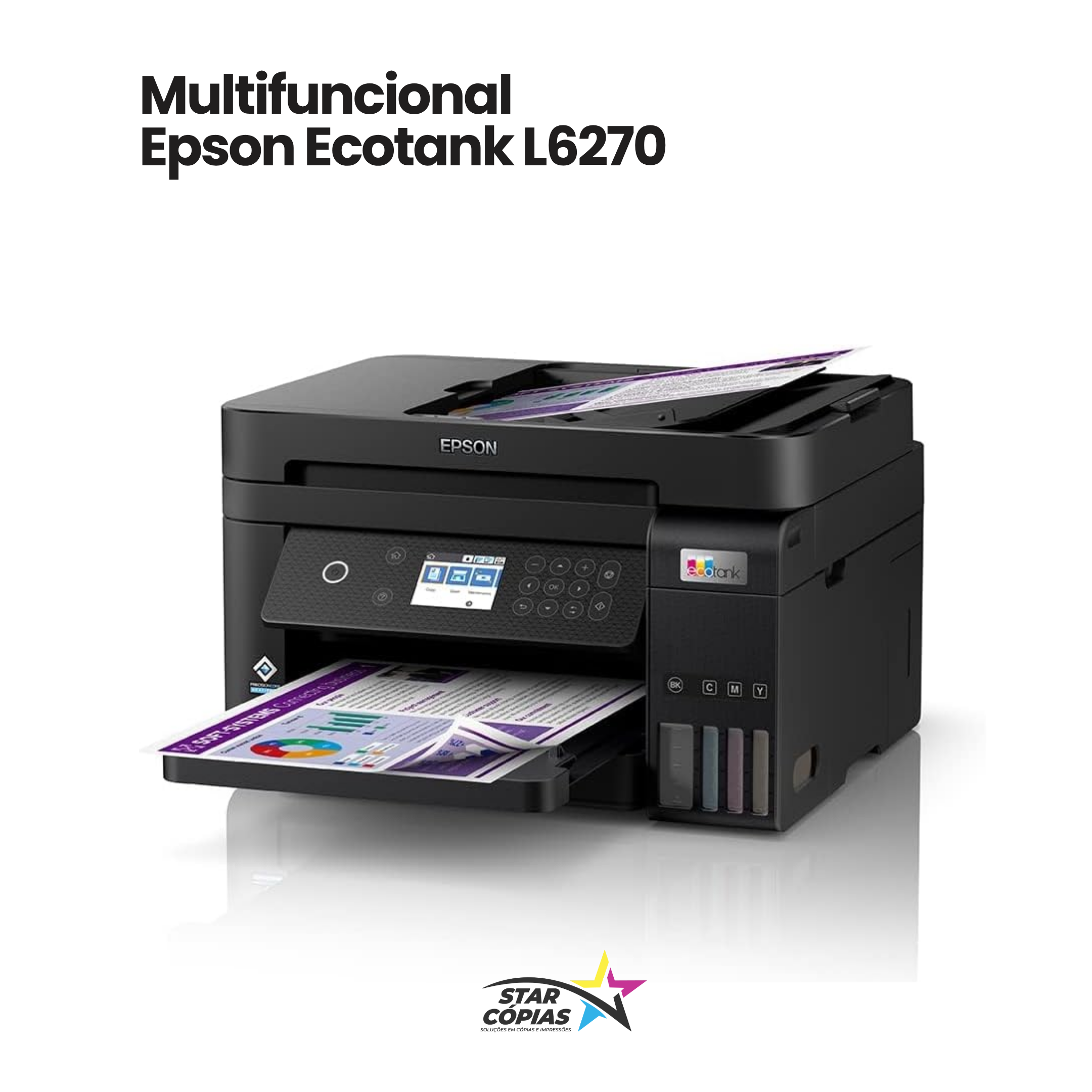 A Epson L6270 é uma multifuncional A4 ideal para quem busca economia, qualidade e eficiência em impressões do dia a dia. Equipada com sistema de tanque de tinta original (EcoTank), este equipamento revisado pela Star Cópias oferece excelente desempenho aliado a baixo custo por página.