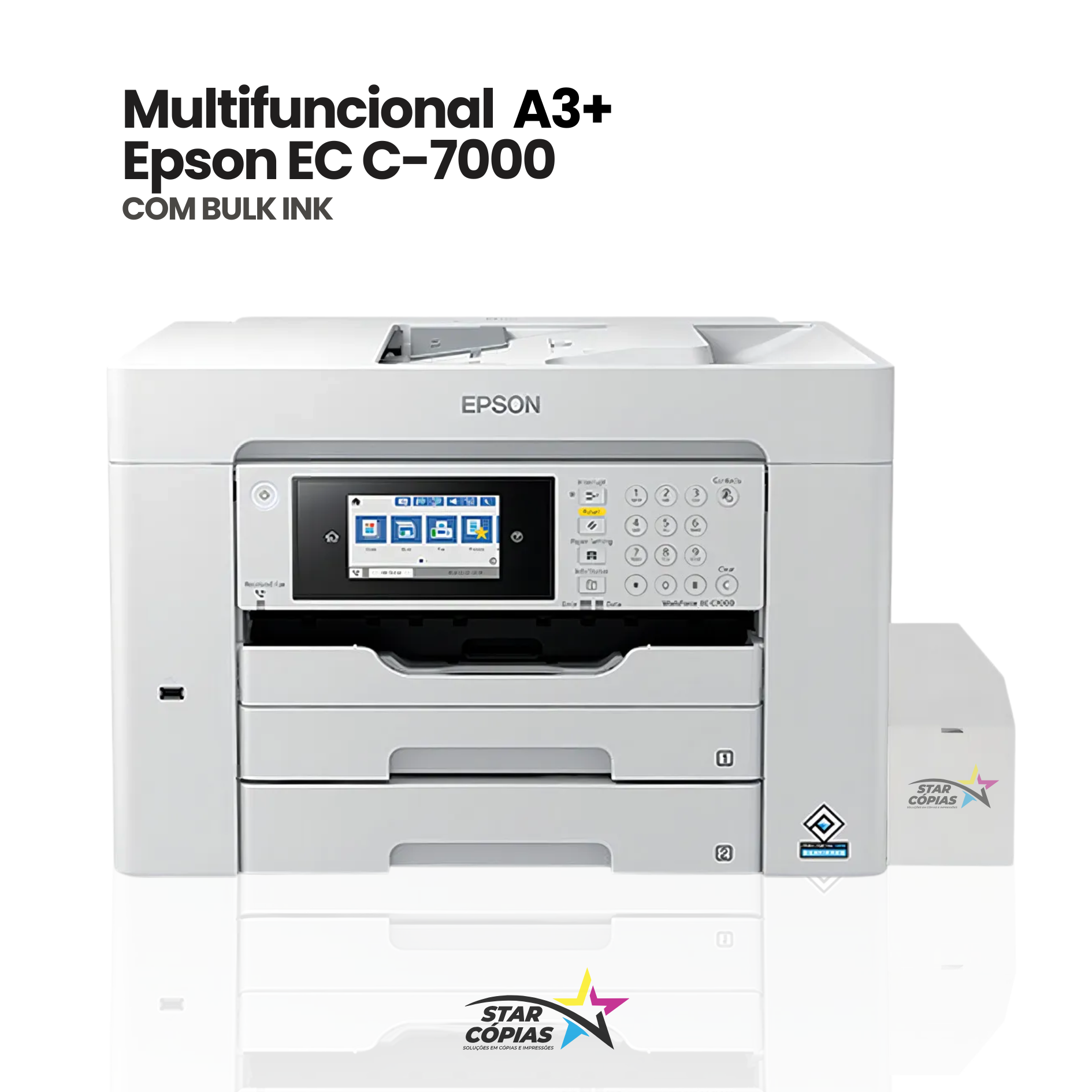A Epson EC-C7000 é uma multifuncional profissional A3+ projetada para quem precisa de alta produtividade, baixo custo e flexibilidade de formatos. Com o sistema Bulk-Ink externo, ela entrega um dos menores custos por página do segmento, mantendo qualidade superior em documentos coloridos, relatórios, tabelas e impressões em grandes formatos.
